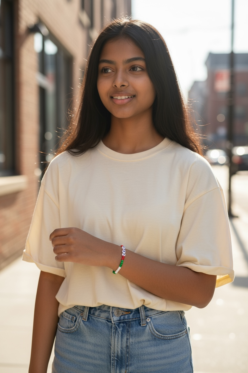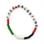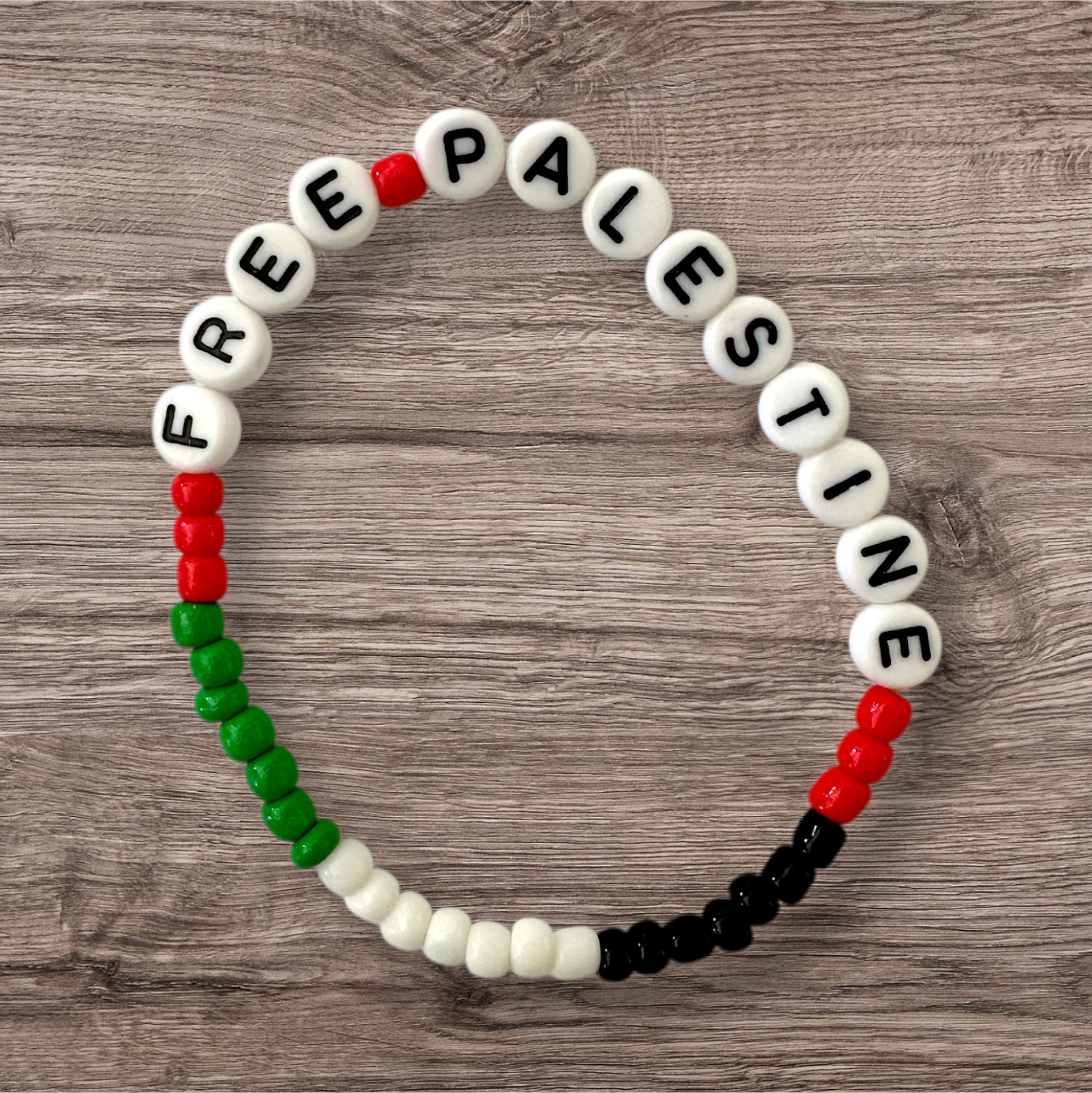 Show your support and stand in solidarity with the people of Palestine with this “Free Palestine” beaded bracelet. Featuring the colours of the Palestinian flag and letter beads that spell out FREE PALESTINE, this bracelet is a bold statement of unity and resistance.